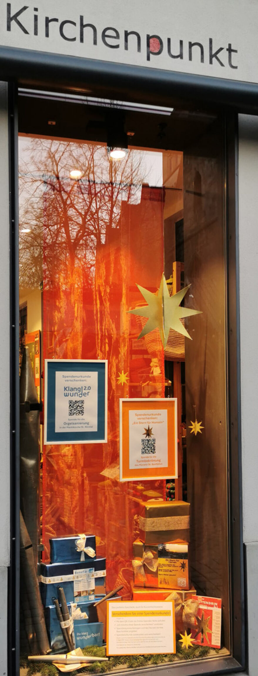 Beim Bummel über den Hamelner Weihnachtsmarkt lohnt sich ein Blick in das Schaufenster des Kirchenpunktes im Haus der Kirche in der Emmernstraße 6, beim Q´Antati-Weltladen. Die Stadtkirchengemeinde präsentiert dort die perfekte Geschenk-Idee – eine Spende für das `Klangwunder 2.0´ – die Orgelsanierung in der Marktkirche St. Nicolai. Oder für `Ein Stern für Hameln´– die Turmbekrönung des Münster St. Bonifatius.