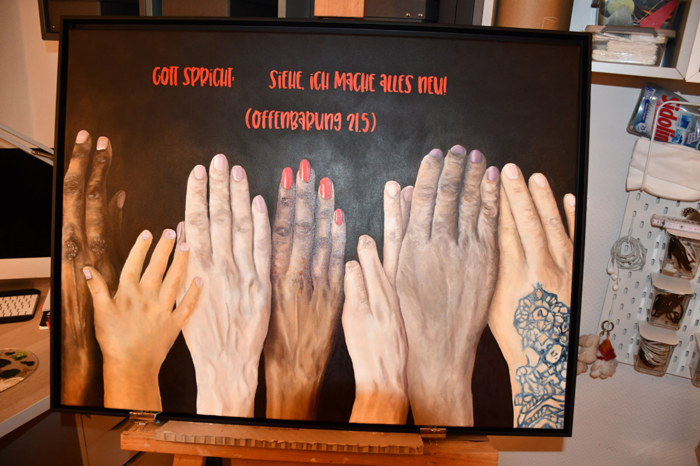 „Meine Grundidee war es, eine Brücke von der Jahreslosung zu den Menschen zu schlagen“, sagt die Künstlerin. Im nächsten Schritt überlegte sie sich, für welche Menschen sie das machen wollte. Die Antwort war für sie einfach – für alle. „Wer sind alle Menschen?“ lautete meine nächste Überlegung. Alle – von jung bis alt vom Kind bis zum alten Menschen. Das wusste ich dann schnell“, erklärt Heike Claus-Römer. Verschiedene Menschen haben verschiedene Hauttypen: So steht die Kindeshand neben einer mittelalten braunen Hand und die wiederum neben einer Seniorenhand. Eine Hand ist tätowiert, die nächste weist zwei fehlende Fingerkuppen auf. „Ich wollte verschiedene Hauttypen zeigen – von unversehrt bis gezeichnet“, berichtet die Künstlerin weiter von ihren Überlegungen. Das Ganze malte sie in Öl auf Leinwand.