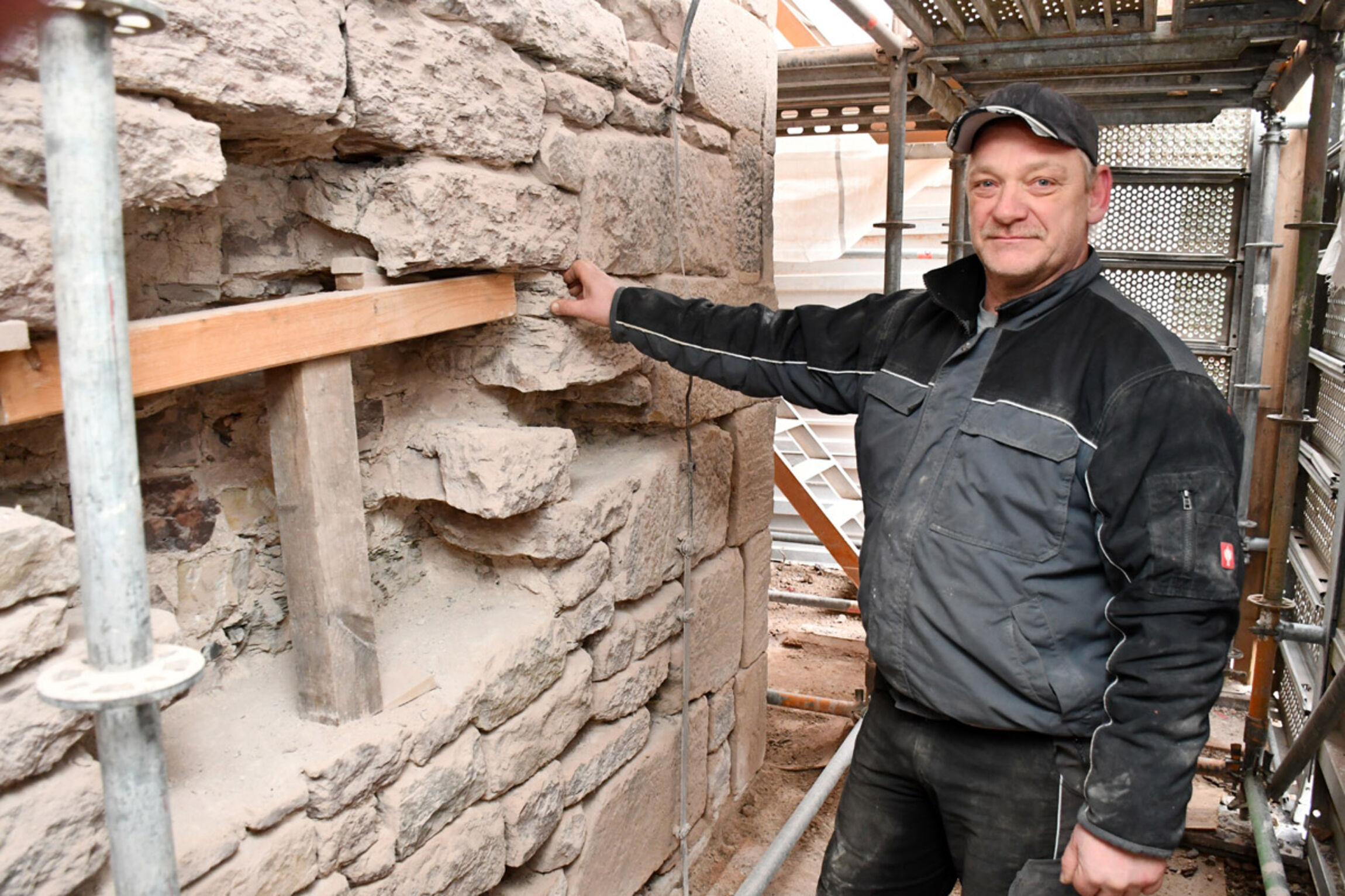 Das Problem: Der Putz wurde zuletzt 1975 erneuert. Dadurch verwitterte der Stein am Münsterturm. Der Putz bröckelte im Laufe der Zeit ab und legte den minderwertigen Schluffstein frei, der nun an vielen Stellen wegbricht. „Wir haben den Putz entfernt und die Verfugungen ausgeräumt. 250 bis 300 Quadratmeter Mauerwerk müssen bis zu einer Tiefe zwischen 20 und 60 Zentimetern mit Sandstein ausgetauscht werden“, weiß Christian Skibbe. Zur Veranschaulichung: Die Mauerwerkstärke beträgt zwischen 1 und 1,50 Meter.