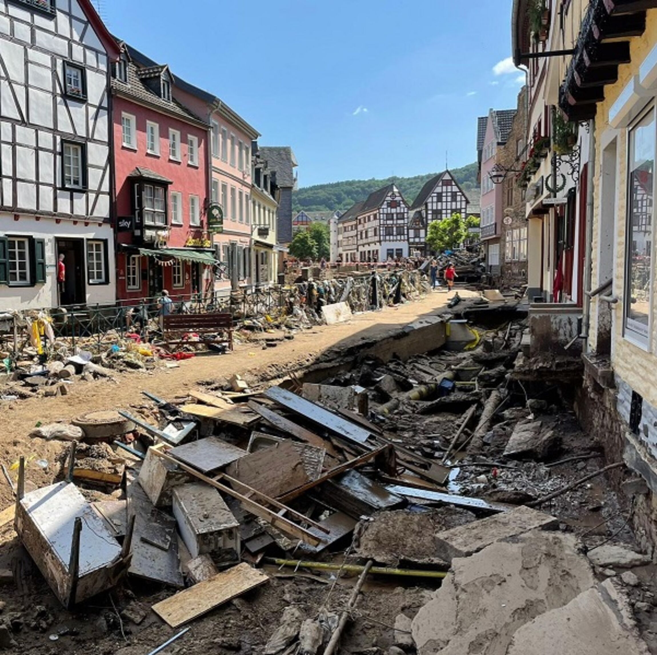 Die Lage in vielen überfluteten Regionen bleibt auch einige Tage nach den extremen Regenfällen angespannt. Das Telefonnetz ist vielerorts zusammengebrochen. Orte sind nur schwer zu erreichen. Menschen mussten mit Hubschraubern gerettet werden. In anderen Teilen Westdeutschlands fließt das Wasser langsam ab und das immense Ausmaß der Schäden wird allmählich sichtbar.