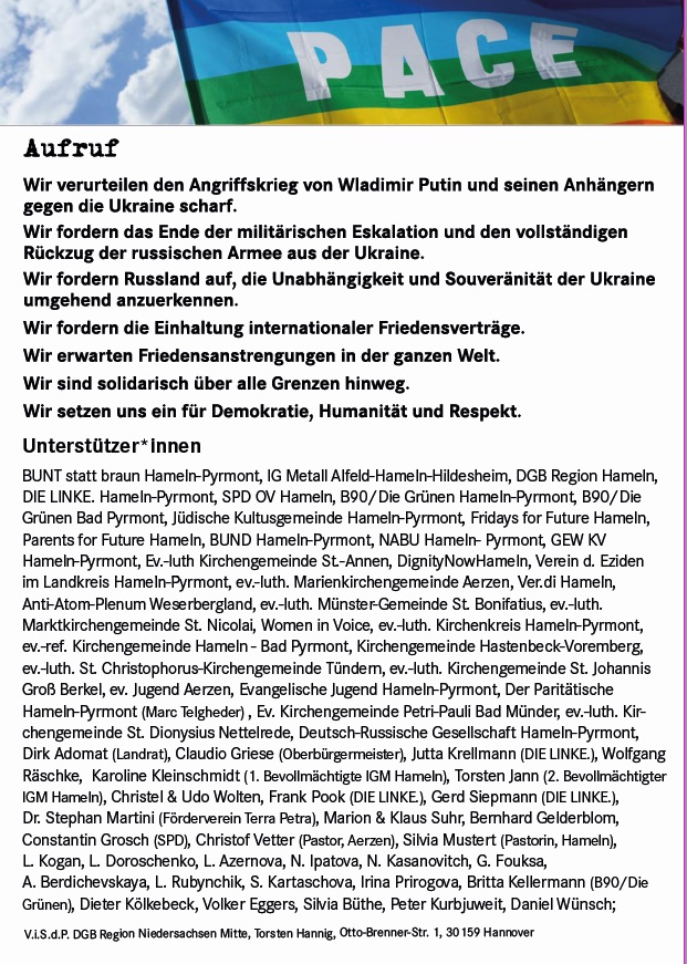 Breites Bündnis ruft zu Ostermarsch in Hameln auf: Start am 16. April um 11 Uhr auf dem Europaplatz vor der Rattenfängerhalle