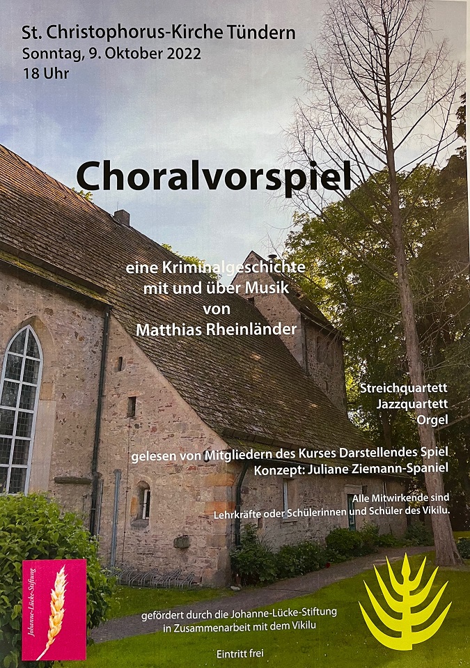Das wird spannend: Das `Choralvorspiel´- eine Kriminalgeschichte mit und über Musik von Matthias Rheinländer - vorgetragen von Lehrkräften und Schüler:innen des Vikilu. Sie lesen und musizieren am 9. Oktober um 18 Uhr in der St.-Christophorus-Kirche in Tündern.