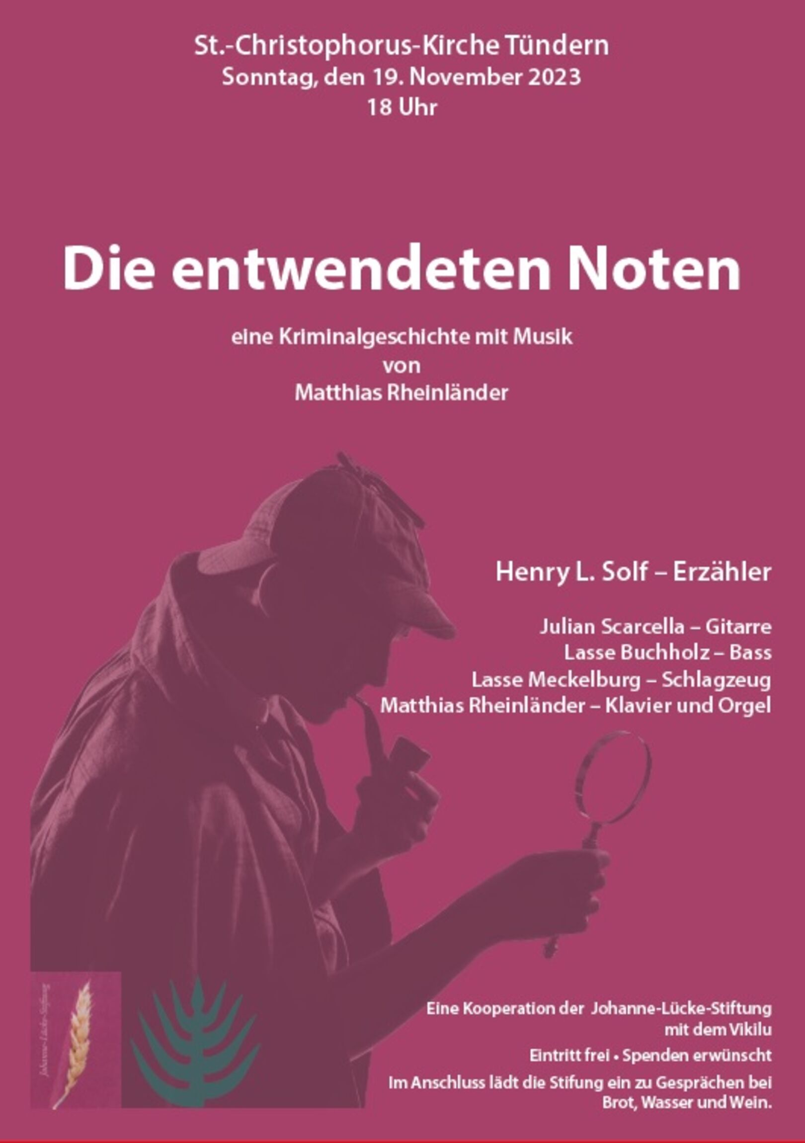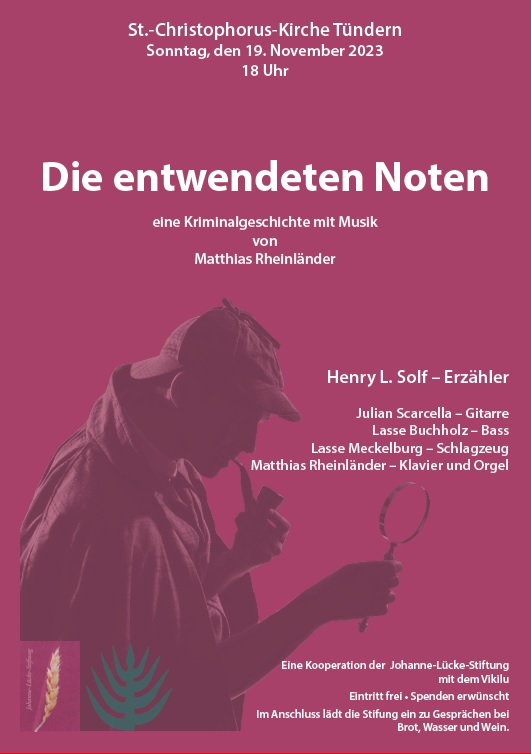 Scott McDuff ist Privatdetektiv aus Edinburgh in Schottland und löst gemeinsamen mit dem Lübecker Pianisten Christoph Schmelzer Kriminalfälle mit und um Musik. Die von Matthias Rheinländer erdachte Geschichte wird am Sonntag, den 19.11.2023 um 18 Uhr in der St. Christophorus-Kirche in Tündern auf geführt.