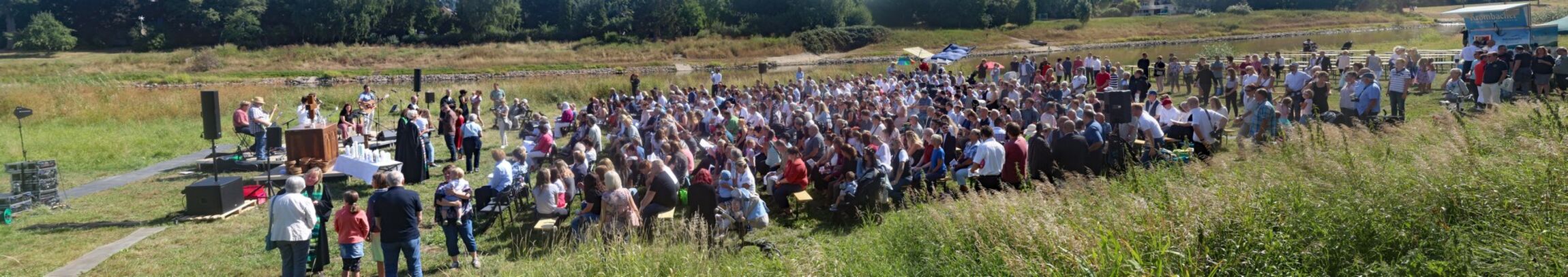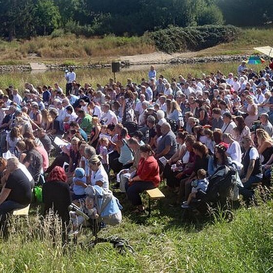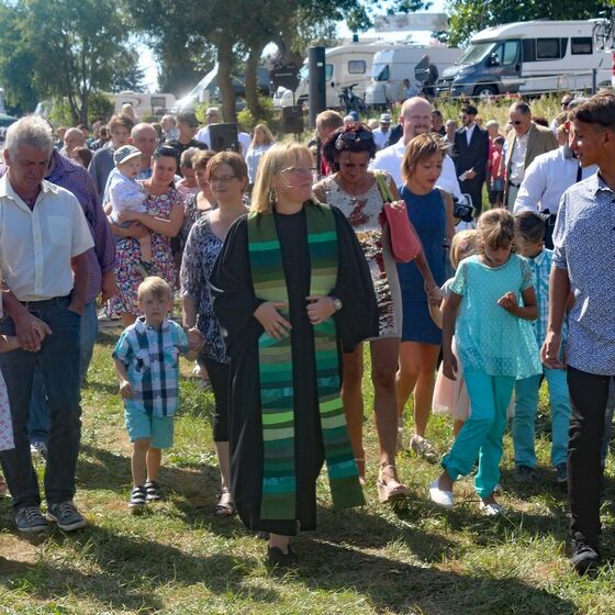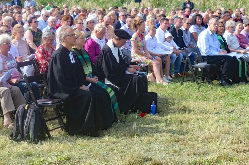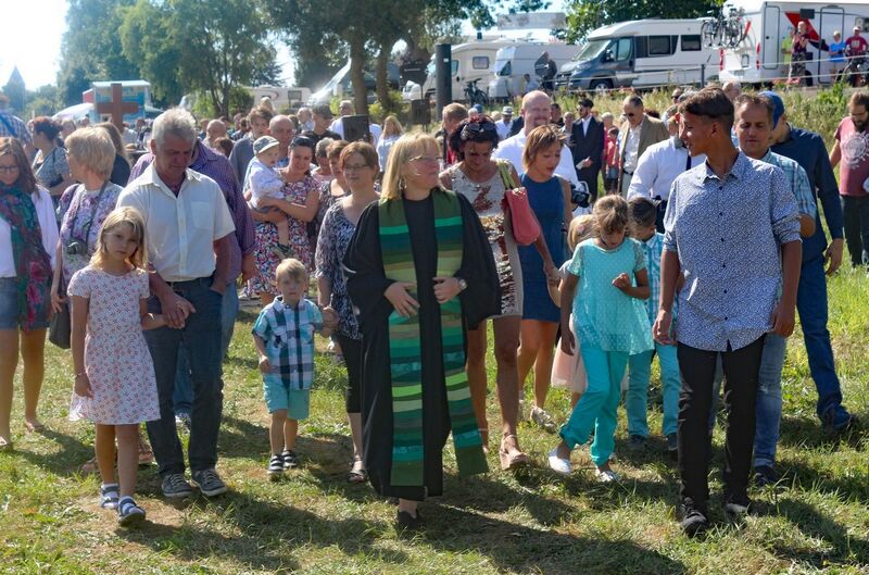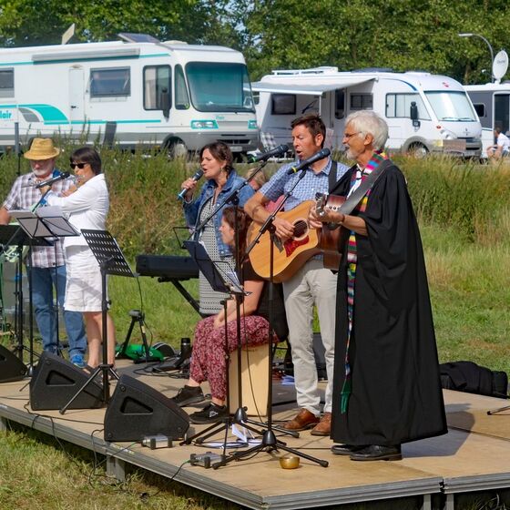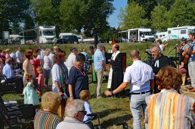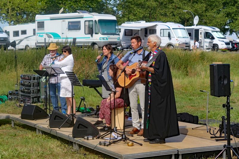Es fanden sich sogar Gäste aus fernen Städten und Ländern zum Gottestdienst ein! Der angrenzende Campingplatz war voll ausgebucht und so waren etliche Urlaubsgäste unserem fröhlichen Treiben zwar zugewand, aber gerne doch im Schatten ihrer Wohnmobile.