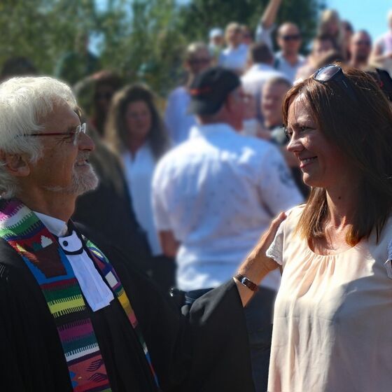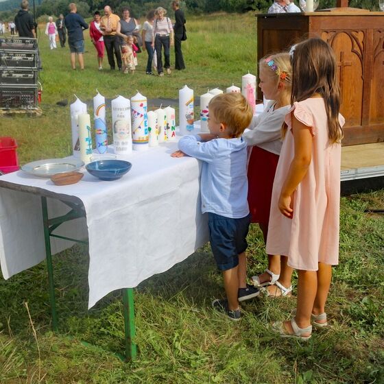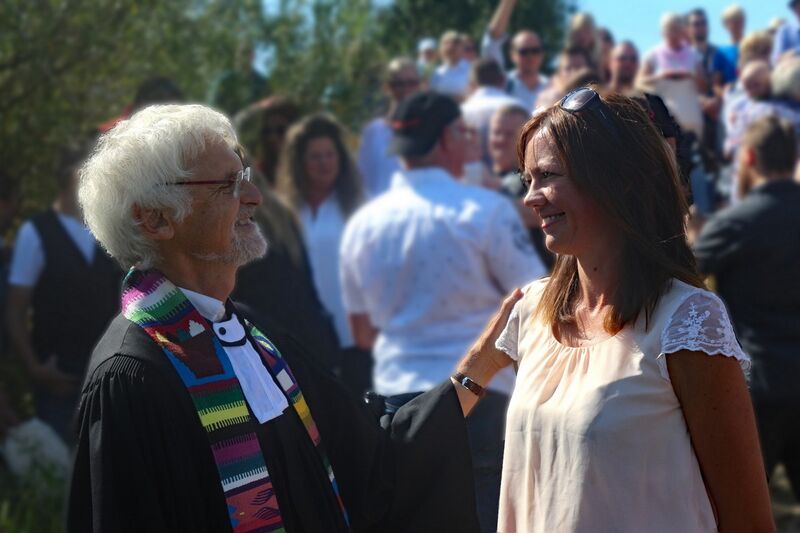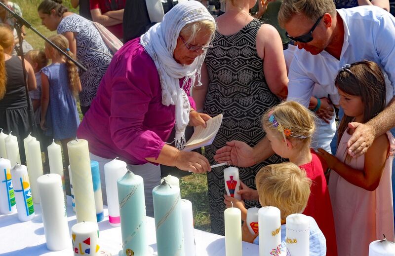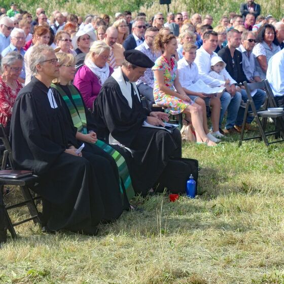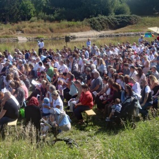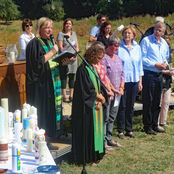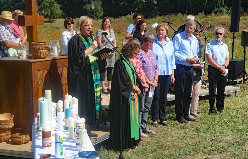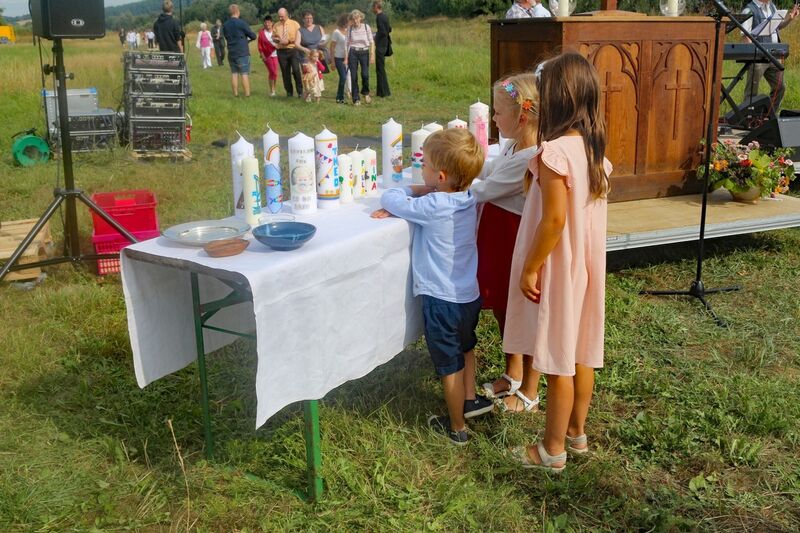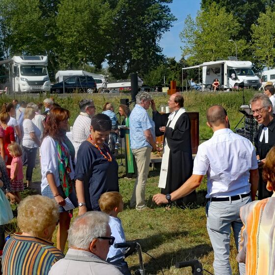 Es fanden sich sogar Gäste aus fernen Städten und Ländern zum Gottestdienst ein! Der angrenzende Campingplatz war voll ausgebucht und so waren etliche Urlaubsgäste unserem fröhlichen Treiben zwar zugewand, aber gerne doch im Schatten ihrer Wohnmobile.