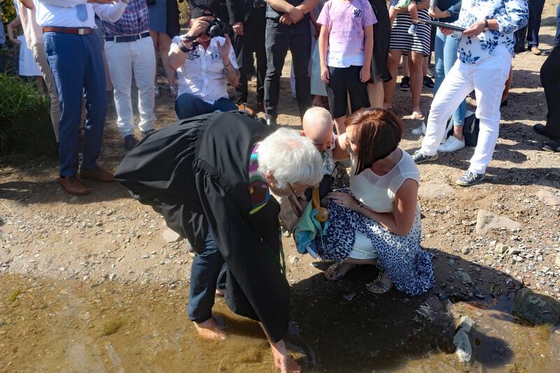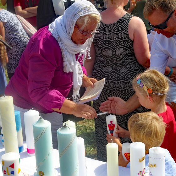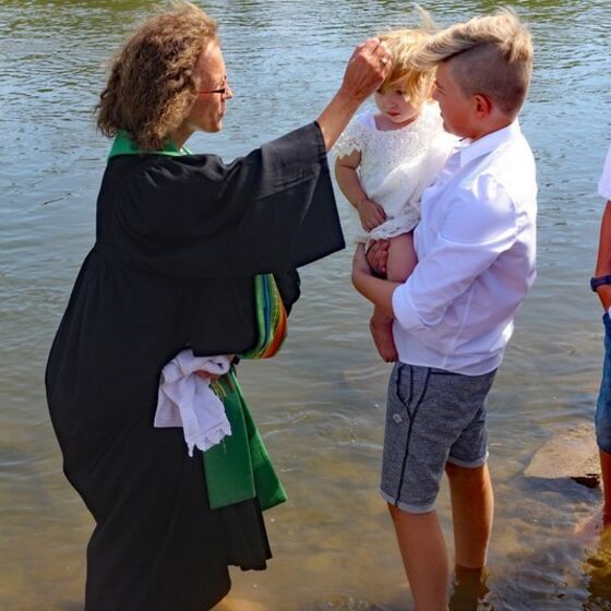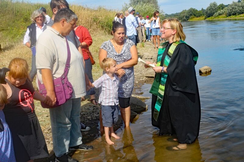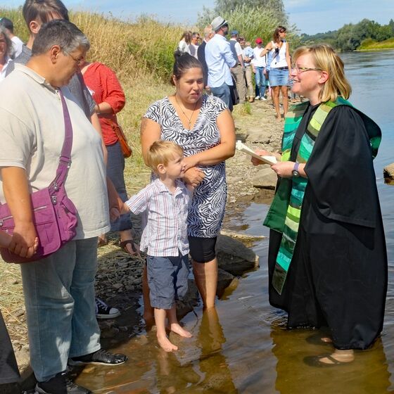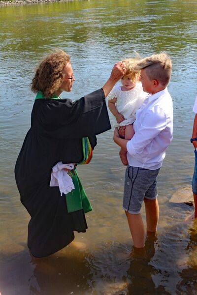 Zum Höhepunkt des Gottestdienstes versammelten sich die Täuflinge mit Eltern und Paten bei ihren Pastorinnen bzw. Pastoren. In Gruppen zogen die Gemeinden an das Weserufer. Nach dem Vorbild von altehrwürdigen Traditionen und Ritualen wurde mit dem Wasser der Weser die Taufzeremonie vollzogen. 34 Täuflinge waren anwesend und empfingen das Sakrament der Taufe. Die Taufe ist eines der ältesten Rituale der christlichen Kirchen.
