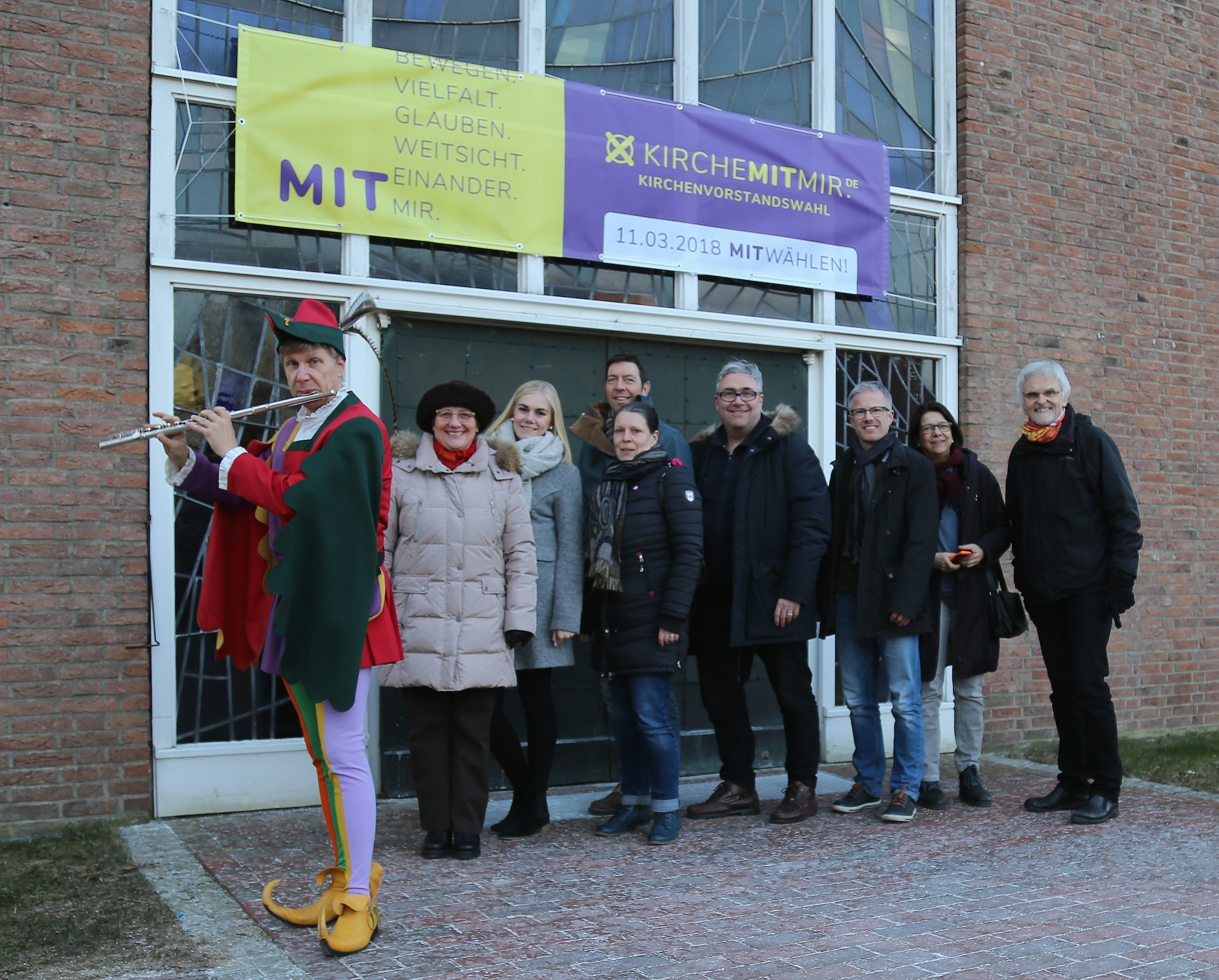Sie haben sich unlängst in einem Gottesdienst der Gemeinde vorgestellt und hoffen auf eine rege Wahlbeteiligung, auch unter den Jungwählerinnen und Jungwählern ab 14 Jahren. Dafür trafen sie sich bei Eiseskälte schon einmal zum Fototermin mit dem Rattenfänger. Es soll ja etwas wärmer werden am Wahlsonntag.