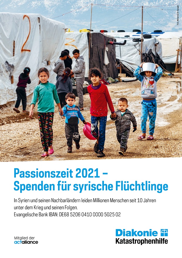 Die diesjährige Aktion zur Passionszeit der Diakonie Katastrophenhilfe richtet den Blick nach Syrien, wo der Krieg nun in sein zehntes Jahr geht. Wir sehen Millionen von syrischen Flüchtlingen – viele sind Vertriebene im eigenen Land, andere sind in umliegende Länder Syriens geflohen, manche noch weiter. Die Folgen für die syrische Bevölkerung sind dramatisch: Ihre Lebensgrundlagen sind oftmals zerstört. Krieg und Vertreibungen haben den Menschen schwer zugesetzt. Seit zehn Jahren leiden Syrerinnen und Syrer unter dem Krieg und seinen Folgen – es sind Menschen deren lange Leidenswege uns in diesem Jahr vor Augen stehen.