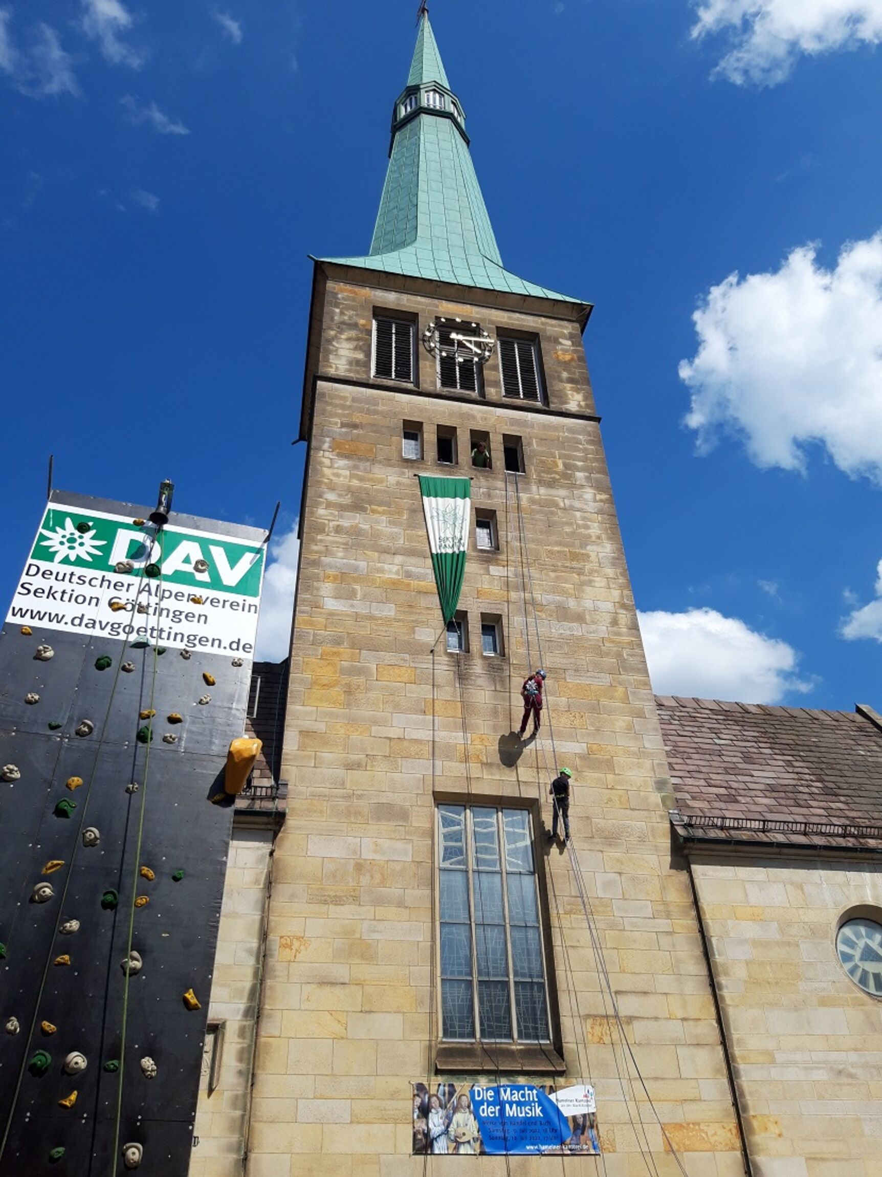 Eine ganz ungewöhnliche Kooperation gab es an der Marktkirche: Der Alpenverein Sektion Hameln hat sein 75 jähriges Bestehen u.a. mit einer Abseilaktion an der Marktkirche begangen. Am laufenden Meter ließen sich Mutige vom Turm abseilen. Um 18.00 Uhr haben wir die Aktion vor der Kirche mit einem Abendgebet beendet. Bergerfahrungen haben uns thematisch begleitet. „Kirchen sind wie Berge in den Städten, sie kommen dem Himmel ein Stück näher.“ Es wird bestimmt ein weitere Kletteraktion geben und dann will der Jugendverband loslegen mit Fassadenkletterei und dabei die Fassade gleich mit reinigen. Was für eine tolle Idee!