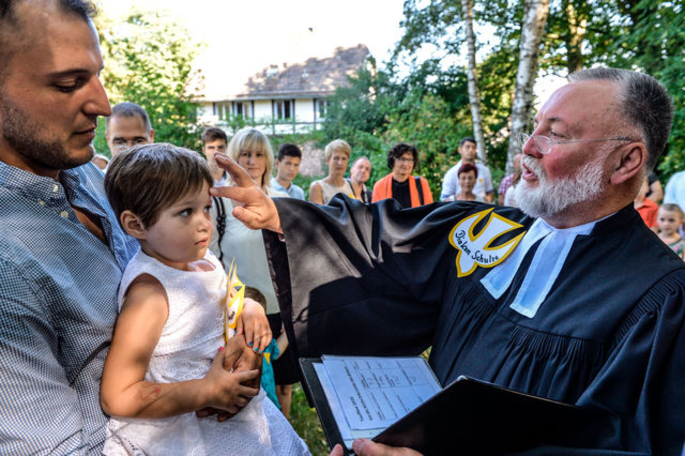 Tauffest im historischen Pfarrgarten unter uralten Bäumen in Beber.