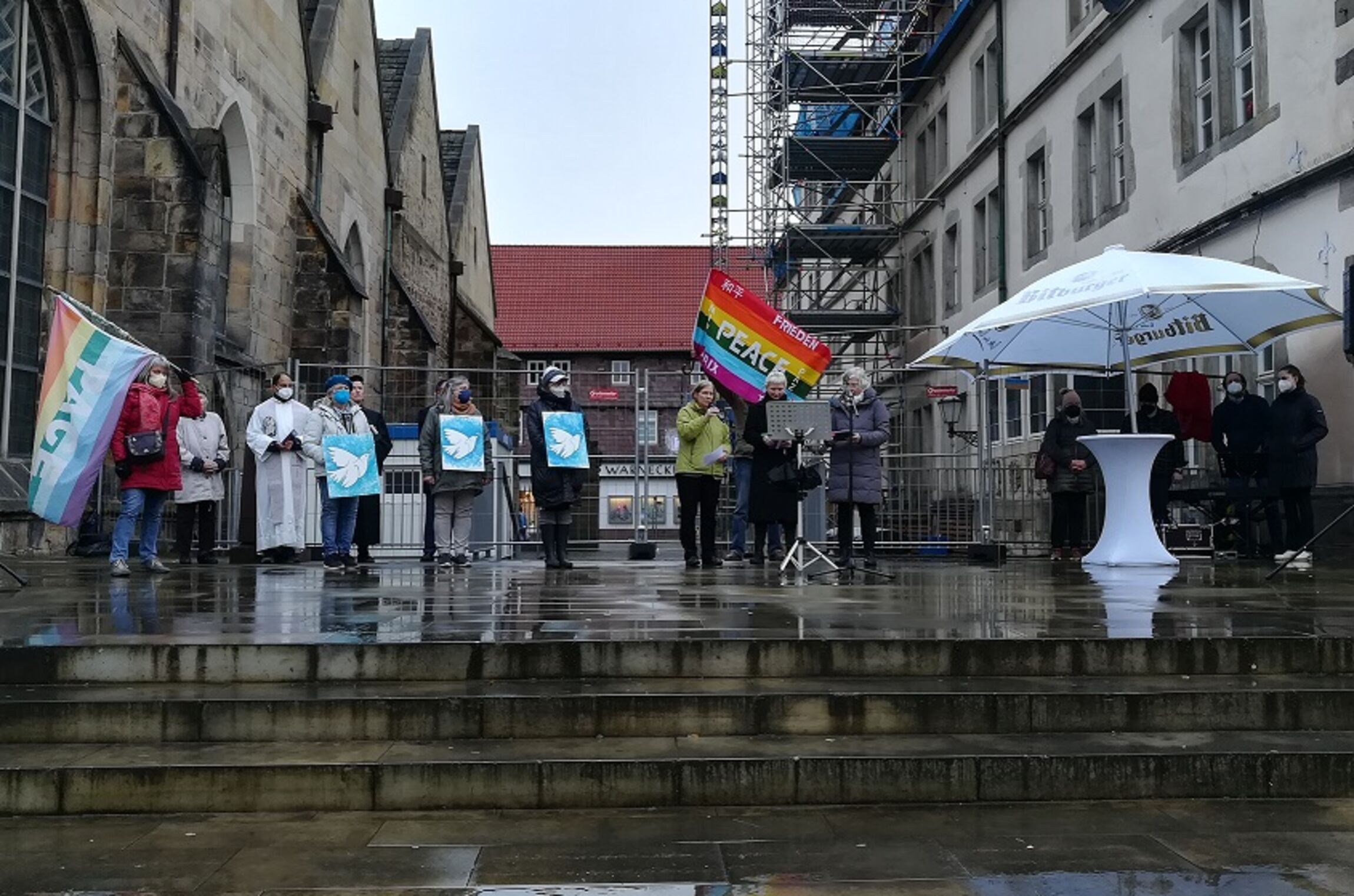 Am Fr., 25.2. hat auf der Hochzeitshausterrasse in Hameln ein interreligiöses Friedensgebet stattgefunden. Veranstalter waren die Stadt Hameln und die Arbeitsgemeinschaft Christlicher Kirchen in Hameln. Etwa 400 Teilnehmerinnen und Teilnehmer gedachten den Menschen in der Ukraine und beteten für den Frieden.