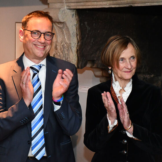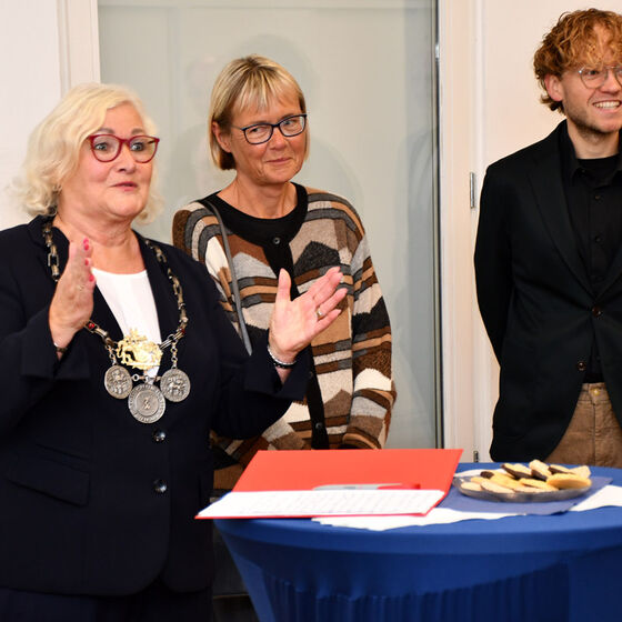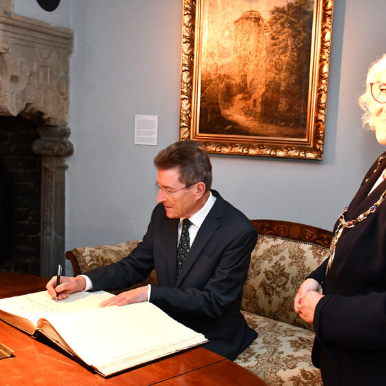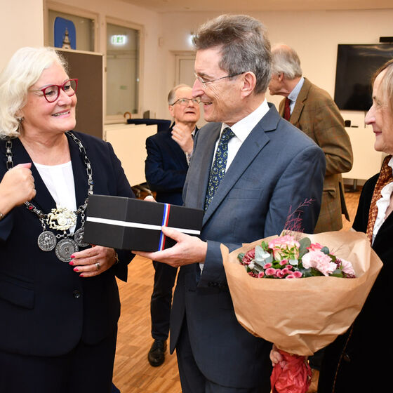 Der Altbischof bleibe in der Öffentlichkeit präsent, obwohl er sich seit 15 Jahren im Ruhestand befinde, hob Echtermann hervor. „Sie bringen sich immer noch gern in gesellschaftliche Debatten ein. 2022 haben Sie ein Buch veröffentlicht, dass sich mit der Ethik der Digitalisierung befasst. Ihr Wirken reicht weit über die innerkirchliche Öffentlichkeit hinaus in die Breite unserer Gesellschaft. Wir sind stolz, Sie und Ihre Frau in unserer Stadt empfangen zu dürfen.“ Für besondere Anlässe nutze die Stadt das Kaminzimmer. „Ich bitte Sie jetzt, dort den Eintrag vorzunehmen“, lud die Bürgermeisterin ins Nachbarzimmer ein. Dort wartete ein großes Buch mit Ledereinband auf Wolfgang Huber. Harald Langguth