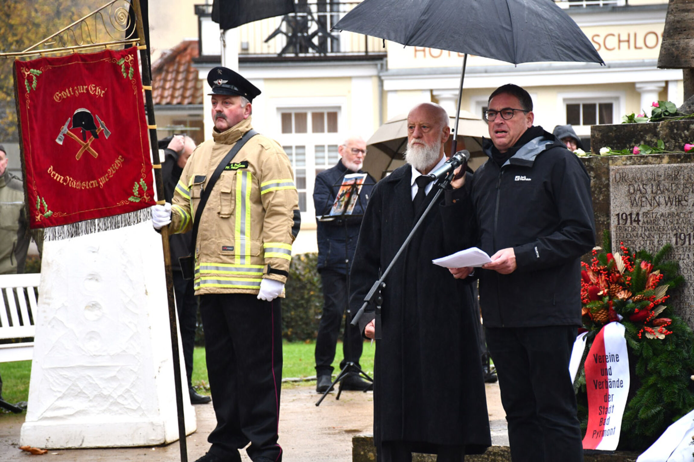 Eindringliche Appelle für Demokratie, eine neue Erinnerungskultur und die wichtige Orientierungsfunktion des Volkstrauertags richteten Helmut Eichmann, Klaus Blome und Dr. Stephan Vasel am vergangenen Sonntag in Bad Pyrmont an die Öffentlichkeit. Abordnungen des Schützenvereins, der Freiwilligen Feuerwehr und der Deutsch-Französischen Gesellschaft Hameln bildeten den Rahmen. Im Vorfeld hatte es am Mahnmal eine Kranzniederlegung gegeben. Der Fokus der Redebeiträge lag zunächst auf dem Ende des Zweiten Weltkriegs vor 80 Jahren. Helmut Eichmann, Pyrmonter Repräsentant des Volksbundes Deutscher Kriegsgräberfürsorge, erinnerte dazu an die Lazarettstadt Bad Pyrmont. „Wir erlebten hier zum Glück keine Luftangriffe – aber das Leiden und Sterben der Verwundeten war allgegenwärtig. Wir schauen heute mit Bangen Richtung Nahost und erschrecken vor dem, was in der Ukraine passiert.“ 60 Millionen Tote, viele Kriegsgeschädigte, Verlust der Heimat, Flucht und Vertreibung seien die schreckliche Bilanz des Zweiten Weltkriegs gewesen.