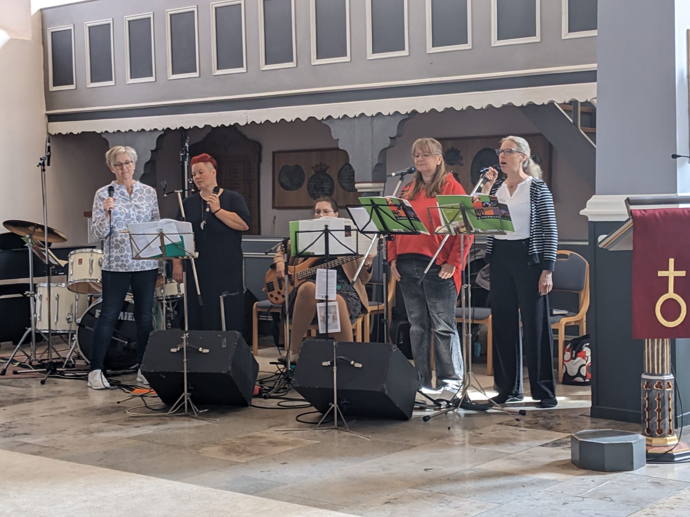Musikalisch begleitete den Gottesdienst die Klingelbeutelband unter Leitung von Matthias Kaspari, bei der Karin Rischmüller mitsingt. Nach dem Gottesdienst, bei dem im Namen Jesu zum Abendmahl eingeladen wurde, trafen sich viele noch bei Tee, Kaffee und Kuchen im Gemeindehaus. Dort gratulierten Bürgermeister Andreas Wittrock und Pastor Christof Vetter der neuen Prädikantin. Christof Vetter