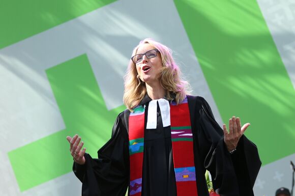 Pastorin Heike Bosien aus Stuttgart predigt beim Eröffnungsgottesdienst des Kirchentags 2019 in Dortmund. Foto: Nadine Malzkorn